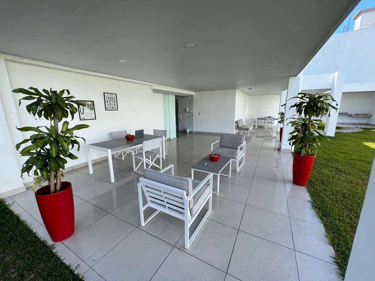 Espacio exterior techado con mesas e hileras frente al césped, ideal para trabajar o relajarse.